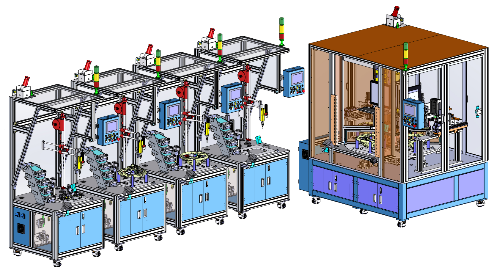 汽车安全气囊组装机,包含自动折叠气袋后将其同防尘罩、保持环、发生器、壳体等组装在一起;该装配线涉及自动拧螺母、电阻检测、自动贴标签等工艺。